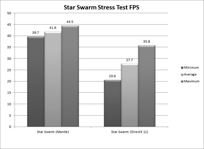 If you haven’t heard of the Star Swarm stress test then you may want to look into it. A quick run down is that this stress test can use both Mantle and DirectX 11 APIs, have 10,000 objects on screen at once, AI controlled which will net you different results each time as you can tell by looking at the average objects on screen. While this isn’t the perfect test since the exact same thing isn’t replicated each time it is run it does still give you an idea about how well your AMD GCN products will do using the Mantle API.