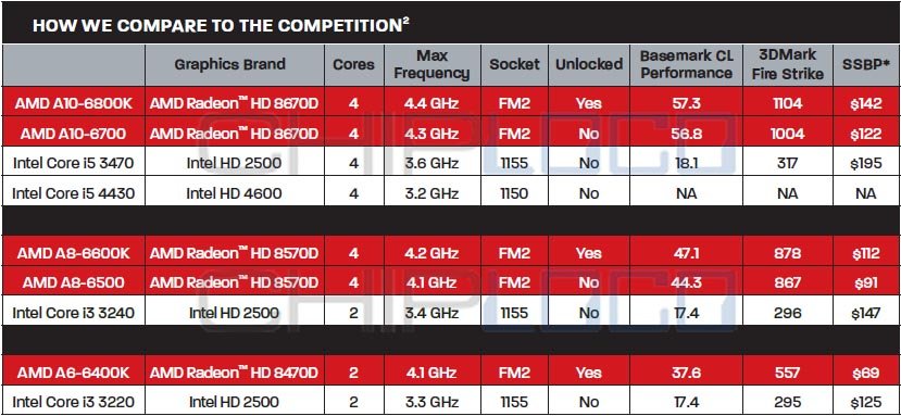 Where ChipLoco got the above image, I’m not entirely sure. It appears to be some sort of marketing image prepared by AMD to showcase their speed, benchmarks, and competitive pricing by directly comparing it to Intel processors. The high-end unlocked A10-6800K will only cost you a modest $142, while still being able to push 4.4Ghz, and is capable of handing most games on low or medium settings.