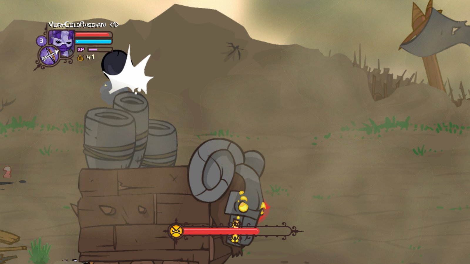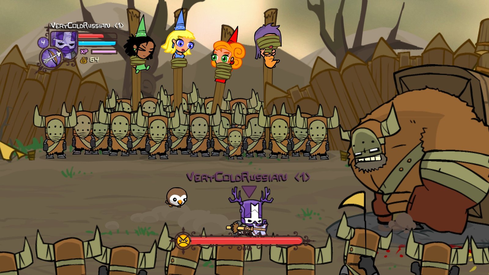 The game takes its players back to side scrolling adventures. The basics of is old school hack and slash. Scroll your way through enemies and boss fights. The enemies you face range from simple minions to unusual bosses. The fights itself are somewhat challenging. Boss fights are a great intermission from the hack and slash play style. Castle Crashers breaks the monotonous gameplay with some level surprises.