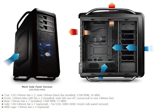 | Cooling System | Top: 120/140mm fan x 2 (one 140mm black fan installed, 1200 RPM, 19 dBA) Front: 120mm blue LED fan x 2 (installed; with LED on/off), or 140mm fan x 1 (optional) Rear: 120mm fan x 1 (installed, 1200 RPM, 17 dBA) Side: 120/140mm fan x 1 (optional) HDD cage: 120mm fan x 2 (optional) |