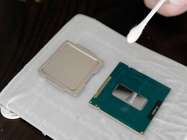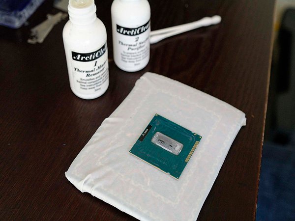 Then get out the ArctiClean bottles again (or your alcohol if you chose that route). Put about 3 drops on the CPU die from bottle #1 and let it sit for 30 seconds. Take a cotton swab and very carefully wipe the paste off in one direction. You should take tremendous care with the CPU die.