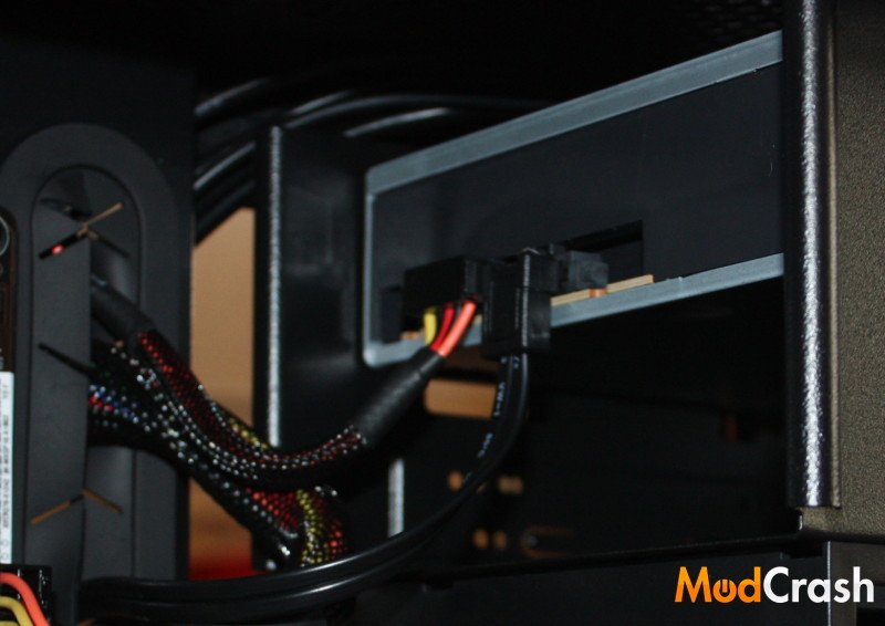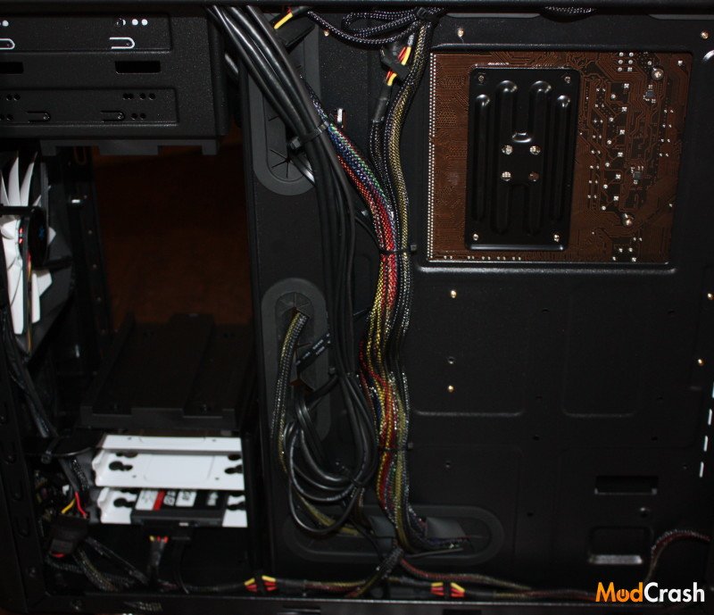 The point of this picture is to give you an idea of the space at the bottom of the case. As you see I have a Fractal Design Tesla R2 650W PSU which measures about 165 mm long which is about the minimum you can have if you plan on using a fan at the bottom but it is a normal size PSU also. You can also see from the first picture on the page and this one that all the cable management holes have rubber grommets on them to help keep air where it needs to be and not escaping behind the motherboard. Although if you did like I did and removed the top HDD cage then its hard to stop that from happening but regardless it is still nice to have them since they help keep control of the all the cables you will have running in and out.