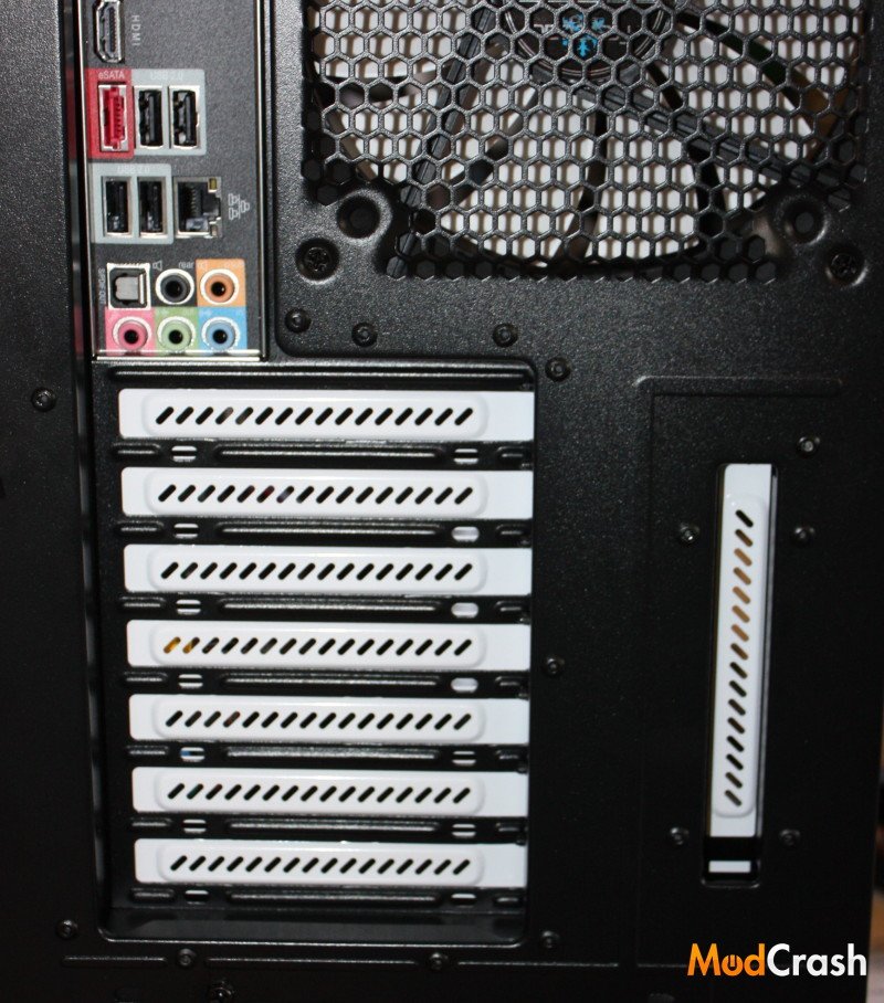 As you can see it has a nice color scheme with everything black but the fans and expansion bay slot covers. If you aren’t using them like you might not with using an APU then it wouldn’t be a big deal but I could see someone not liking it when they put in a sound card or graphics card. Like I said since you most likely won’t see the back of the case it shouldn’t be a big deal.