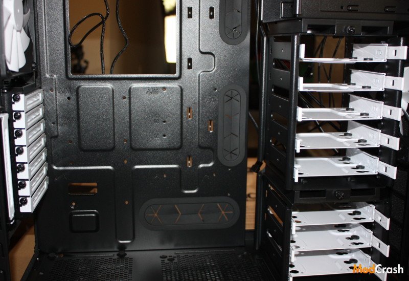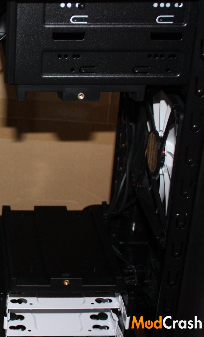 With this picture i wanted to show the case bare. It has nothing in it except the silent R2 fans that Fractal has included. As you can see the side panels are off to see just how the inside looks. I have to say I was impressed with the inside. It looked to have plenty of room and all the mounts and bays that normally you would think only come with ultra and full towers. Overall it has 10 different bays for 2.5″ drives or 8 for 3.5″. You do not need anything other than screws that came with your hard drive or SSD, but Fractal has also provided some screws for you to use if you do not have them. The final thing about the hard drive cages is that both of them can removed with simple thumb screws.