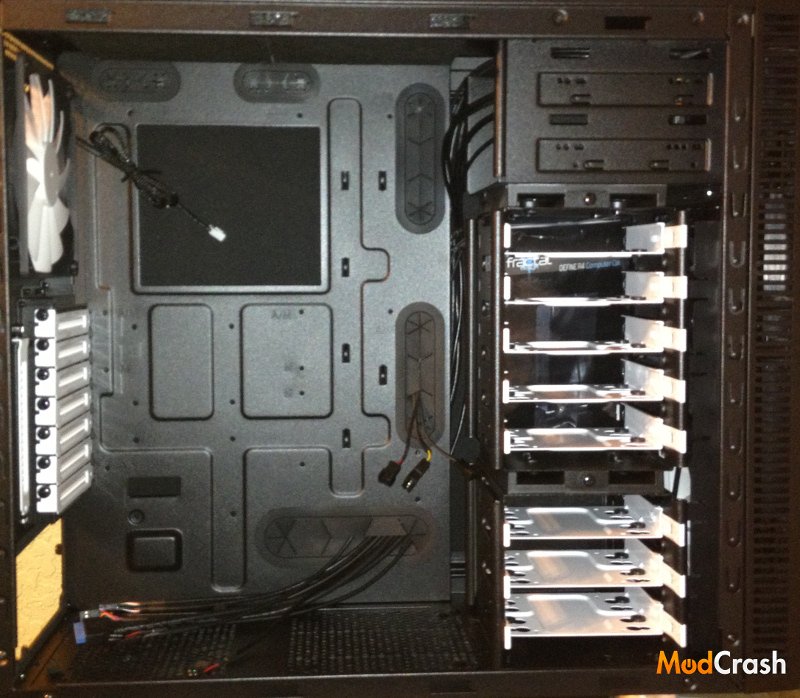 The Fractal Design Define R4 has an accommodating layout for modern hardware. With the bottom and middle storage bays being removable, the Define makes for a great enthusiast case. With the storage bays out, you can place a 240mm radiator to cool a dual GPU setup or for better airflow. The top of the case has room for 2 x 120mm fans or another 240mm radiator to cool your processor. For me, I am a water cooling nut so I am quite drawn to the layout of a well thought out case. Fractal Design had put alot of time and effort into the Define R4 not only for practical use, but also enthusiast use. With 8 optional storage bays and two 5.25″ drive bays, you will never have to worry about space for drives or components.