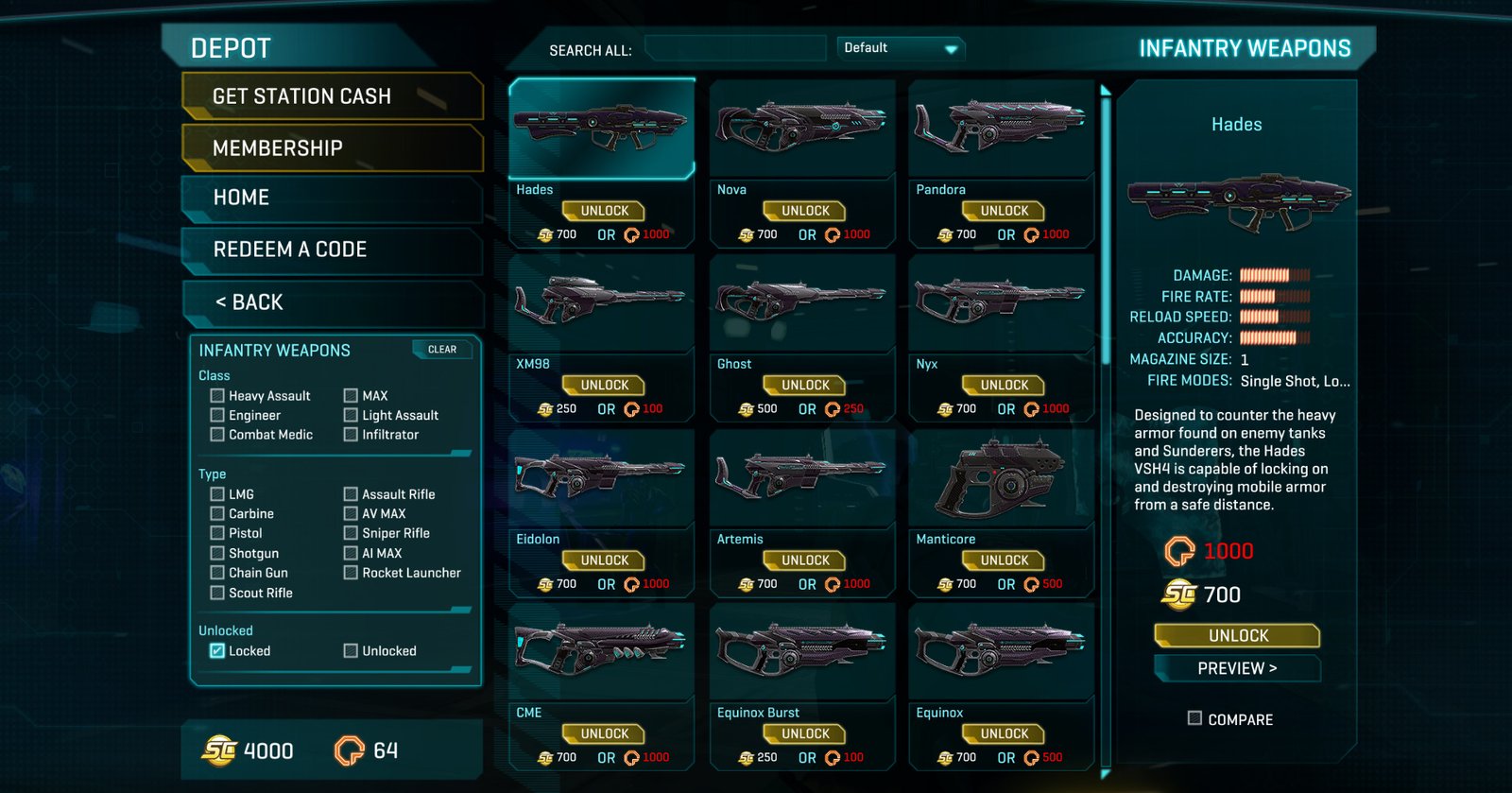 Chances are though, you’ll have no idea what to do just like I did and probably quit playing your first day. This game is really one of those games you need to research a bit, or play with a friend, before you can fully understand what is going on. I suggest going back to the warp gate by accessing your map and clicking on the icon over the warp gate on the map. This too may be slightly difficult, but you’ll get the hang of the map after a few uses. The Warp Gates are the only permanent structures in the game, meaning they are also the only safe zones in the game. At the Warp Gate you can visit a weapons terminal to upgrade and resupply your character, change your class, or visit a vehicle terminal to purchase a vehicle. This is a good place to play around with your classes, test the weapons, and hop in a vehicle where you’ll probably fly directly into a building and blow up immediately. What I’m saying is, get used to some large failures before you completely understand how to play. You just can’t jump in a game this large, and this complex without failing a few times. To make it a bit easier, let us take a look at what is available to you and what it does.