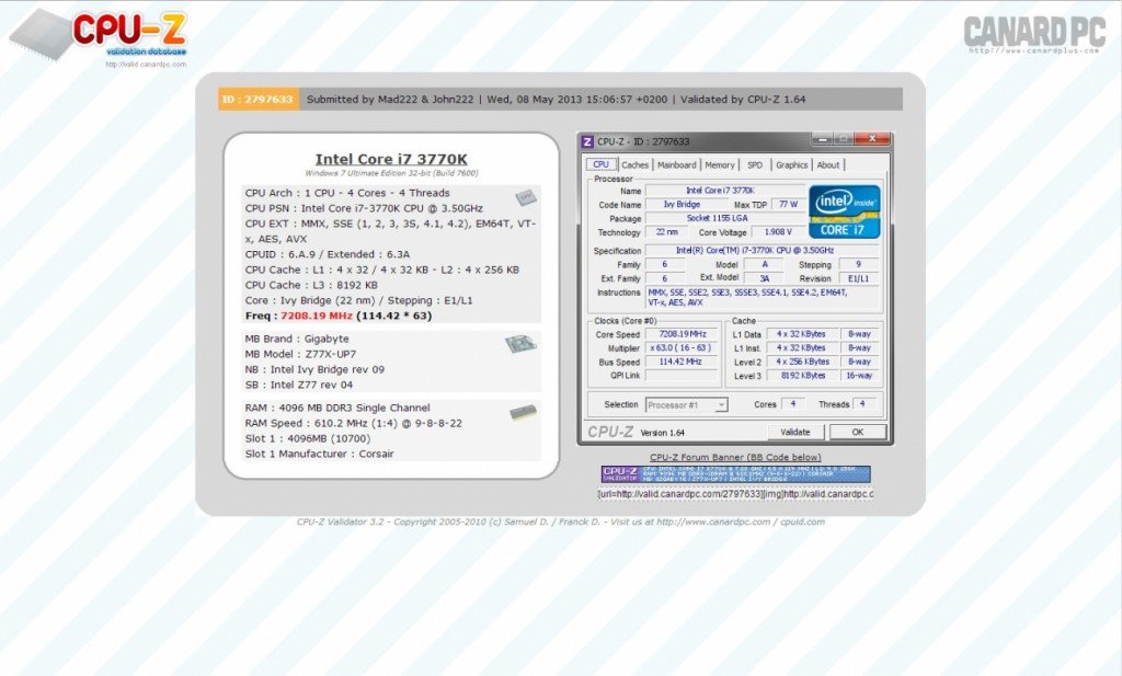 Users Mad222 and John222, achieved this overclock yesterday, May 8th, 2013, using a Gigabyte Z77X-UP7 motherboard and 4GB of DDR3 clocked at 1200Mhz. The overclock was achieved using a core voltage of 1.908v a core multiplier of x63, and base clock of 114.42Mhz. With those settings Madd222 and John222 were capable of reaching an incredible 7208.19Mhz on a CPU that comes stock at only 3500Mhz or 3900Mhz turbo. That’s an amazing 105.94% increase over stock speeds!
