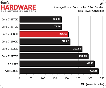 Tom’s Hardware did quite a few benchmarks on this pre-production processor, the results some could say are disappointing. Overall it looks like the Intel i7-4960X Ivy Bridge-E is going to be about 5% faster than Sandy Bridge-E based off all of the benchmarks. Now one area that the Intel 4960X Ivy Bridge-E does do alot better than its predecessor is energy consumption.