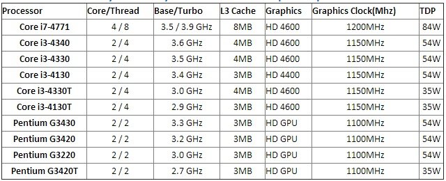 The guys over at WCCFTech were kind enough to make the image above to show all the CPUs that will be introduced and released into the Intel Haswell family. This is a great chart since it shows the CPU, cores/threads, base/turbo clock speeds, L3 cache, which integrated graphics it includes along with the graphics clocks, and the TDP of the CPU. While all these chips will be new the i7-4771 is an interesting one that is included. This CPU will basically replace the i7-4770. The i7-4771 will have a locked multiplier but will see a gain of 100 Mhz in clock speed from the i7-4770. The i7-4771 should be priced the same or close to the i7-4770. As for all the other CPUs on the list we will have to find out their price points when they are announced from Intel or unless someone is able to “leak” the prices here in the next couple of months ahead of the announcement.