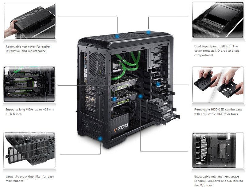 | 2.5″ Drive Bays | 10 (hidden; 7 from the HDD/SSD combo cages, 1 under the ODD cage, 1 behind the M/B tray,1 at the bottom) |