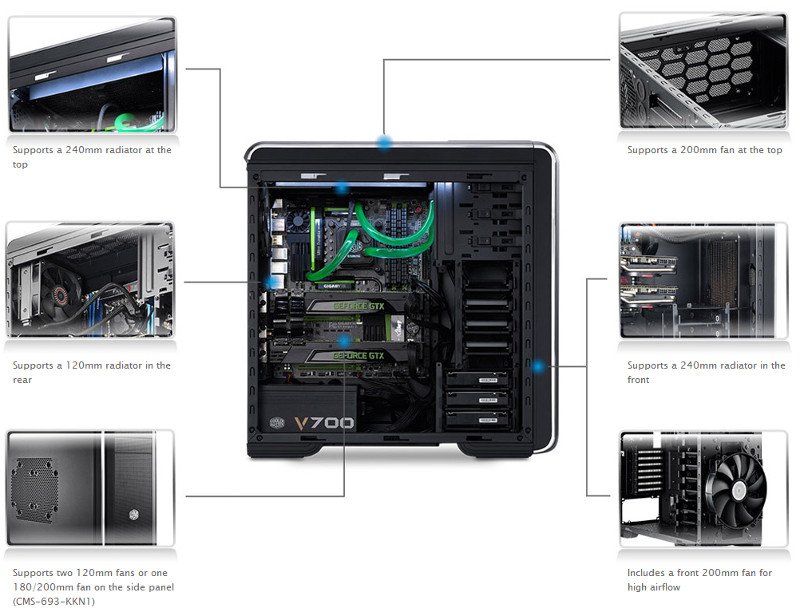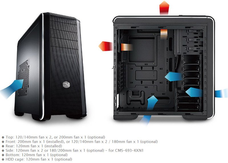 New series of cases come and go from everyone but this time around a new spin is being put on an old series with the Cooler Master 690 III being shown off. This is will be an update from the Cooler Master 690 II with a the exterior staying more or less the same but the interior being completely redesigned for liquid cooling, SSDs and HDDs, dust filters, and fan support. Alright so I’ve told you what has been redesigned for the customer lets us get into some details. First off for the ever grown SSD mounting needs the Cooler Master 690 III has room for up to 7 3.5″ HDDs or 10 SSDs. You can now use 240 mm radiators in the front and top with room left to stick a 120 mm in the rear of the case. Fan mounts have been expanded for up to 9 fans and Cooler Master is going to go ahead and include three 200 mm fans to give you some great airflow out of the box.