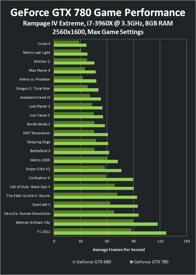 Even at a demanding resolution of 2560×1600 the GTX 780 outperformed its predecessor by a good margin in everything from Crysis 3, Metro: Last Light, and Battlefield 3.