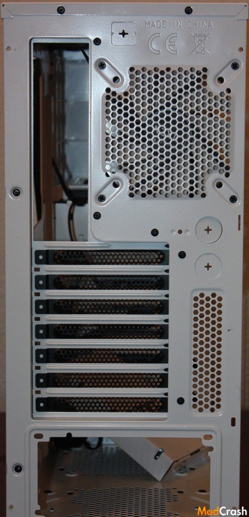 The rear of the case and as you may of noticed is it does have two punch out tabs for running tubing for a custom liquid cooling setup.