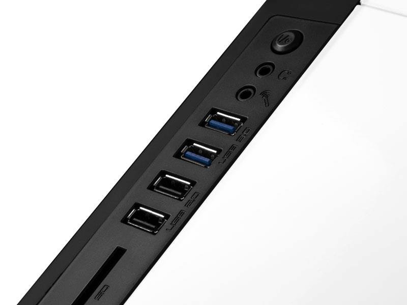 The front panel consist of 2x USB 3.0 ports, 2x USB 2.0 ports, a 3.5mm mic jack, a 3.5mm headphone jack, and an SD Card reader.