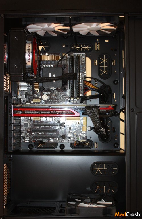 Now onto the front! As you see this case is HUGE! Now think about this, the GPU I used for the picture is the massive AMD Radeon HD 7990. Yeah AMD’s flagship GPU up until recently but still one of the biggest on the market in terms of sheer physical dimensions. Make it look like a baby GPU in my opinion instead of the beast that it is. One thing I did not get a picture of is if you do have a shorter GPU that Phanteks does have a cover that well covers your cables going to the motherboard. It basically covers the main 24 pin power connector, SATA ports, ect. The bottom of the base is very spacious and it almost give this build a very minimalist look to it since to me it looks like almost nothing is inside this case.