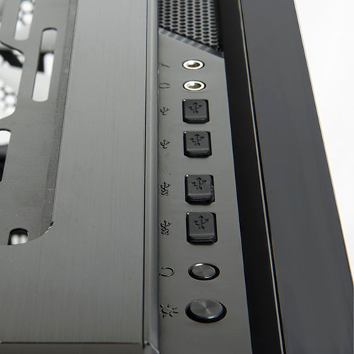 Taking the cover off the front intake fans in very easy to do along with putting it back on. It simply slides and snaps into place without much effort and doesn’t move afterwards. As you see the door opens to five 5.25″ optical bays to put anything you want from a DVD drive to a fan controller. Mind you that if your fan controller does have physical knobs or switches that protrude out from the face that it will not work in this case with everything flush. You would have to recess your fan controller into the case.
