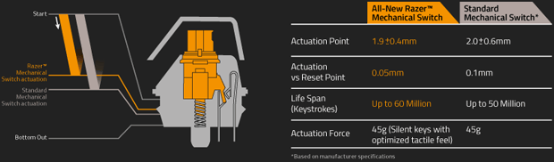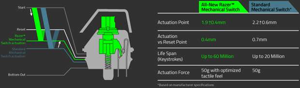 “The all-new Razer Mechanical Switches have an optimized set of actuation points that improve your gaming performance by giving you speed and responsiveness like never before. Requiring a force of only 50g to actuate, these new switches reset at almost half the distance of traditional mechanical switches, so you can double-tap effortlessly with blazing speed. While conventional mechanical switches are great for typing, the Razer Mechanical Switches are engineered to enhance both your gaming and typing experience.”