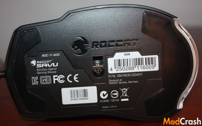The bottom of the ROCCAT Savu shows the sensor and other pertinent information about your mouse.
