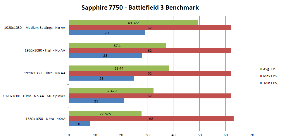 The Sapphire HD 7750 did well running Battlefield 3. It was very playable at all setting without AA. This card only has 1GB of ram so that was not a shock but everything was smooth. As you can see we got acceptable frame rates after with AA turned off on Ultra, High, and Medium setting. We tested at 1050 with AA and after that decided it was not worth it to run at 1080 with AA since the minimum frame rates were so low. This card does give you the ability to play Battlefield 3 at high settings though.