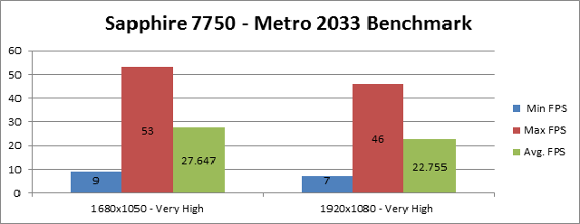 The Sapphire HD 7750 did well at times playing Metro 2033. It did get bogged down in certain areas but overall it was playable and when you turn the setting down it just get even better. We did see a small increase going from 1050 to 1080 on very high. Overall the card preformed admiralty considering it is the lowest of the 7000 series.