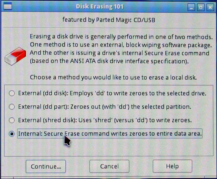 This menu gives you multiple options for erasing your HDD or SSD and for SSDs we want to use the “Internal: Secure Erase Command”. Afterwards hit continue.