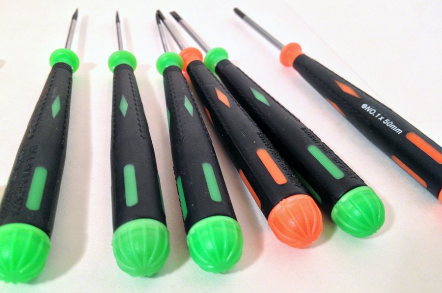 The screwdrivers have rubber grips and a rotating top that will allow you to keep control while applying pressure when using them. The rubber grips are extremely helpful for getting tight screws out. Also, the width of the grips is pretty comfortable since they are thicker than usual for somewhat mini screwdrivers.
