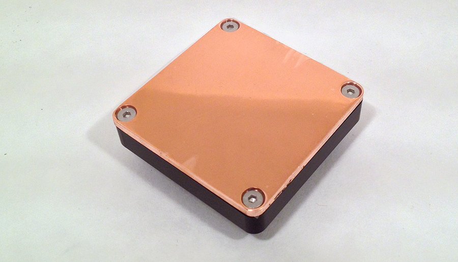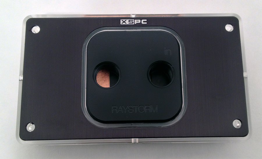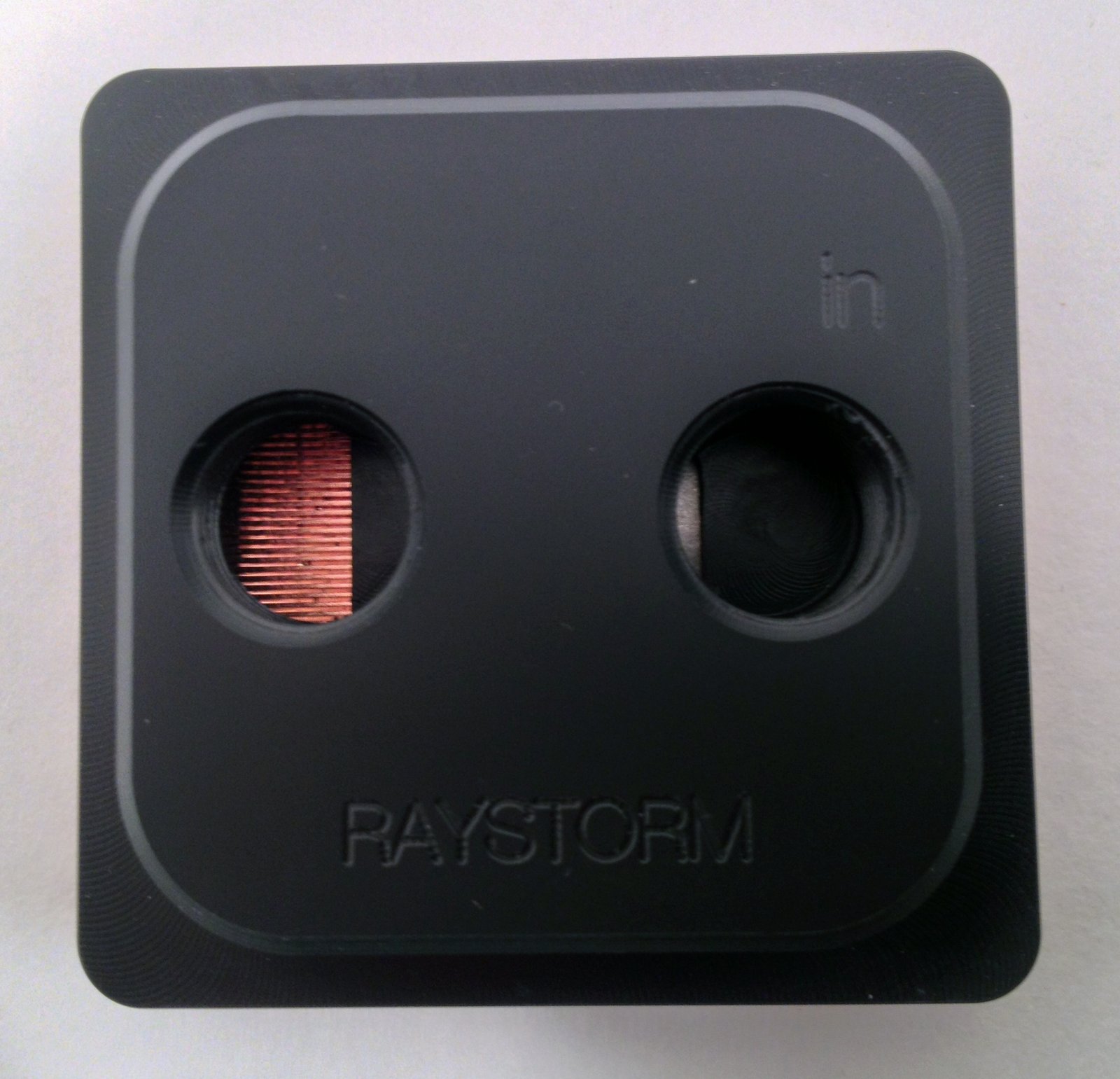 From the top view of the RayStorm you can see the in and out ports. The out port shows its copper off letting you know the block isn’t mostly nickel. This is the block without any mounting bases on it yet.